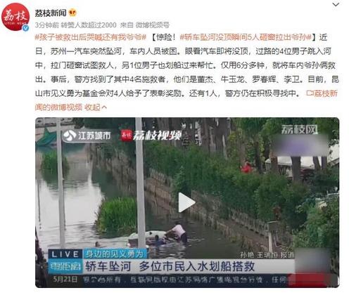 近日,在蘇州市發生了一場驚險的事件。一輛汽車突然墜入河中,車內的人員陷入困境。然而,幸運的是,幾位過路的勇士挺身而出,毫不猶豫地跳入河中,試圖救出被困的人。其中有四位男子勇敢地拉動車門,砸擊窗戶,竭盡全力進行救援,而另一位男子則劃船前來協助。令人鼓舞的是,僅僅用了六分鐘的時間,他們成功地將車內的爺爺和孫子救出。