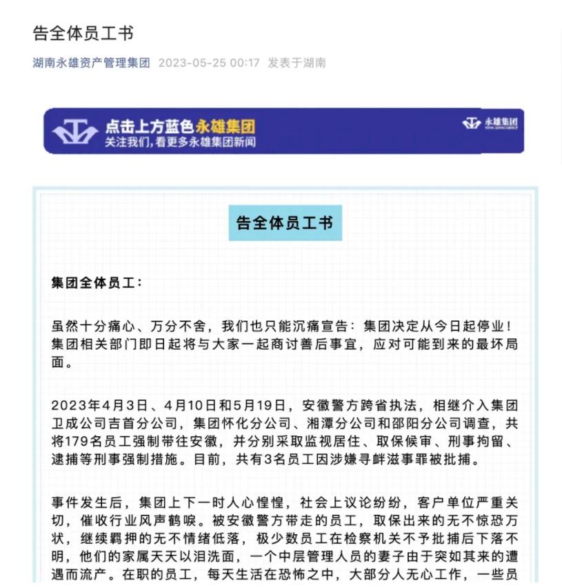 湖南長沙總部的湖南永雄資產管理集團有限公司(以下簡稱“永雄集團”)近日宣布停業,引發了廣泛的關注。據該集團發布的《告全體員工書》,多地分公司的工作人員被警方帶走調查,集團面臨可能的最壞局面。