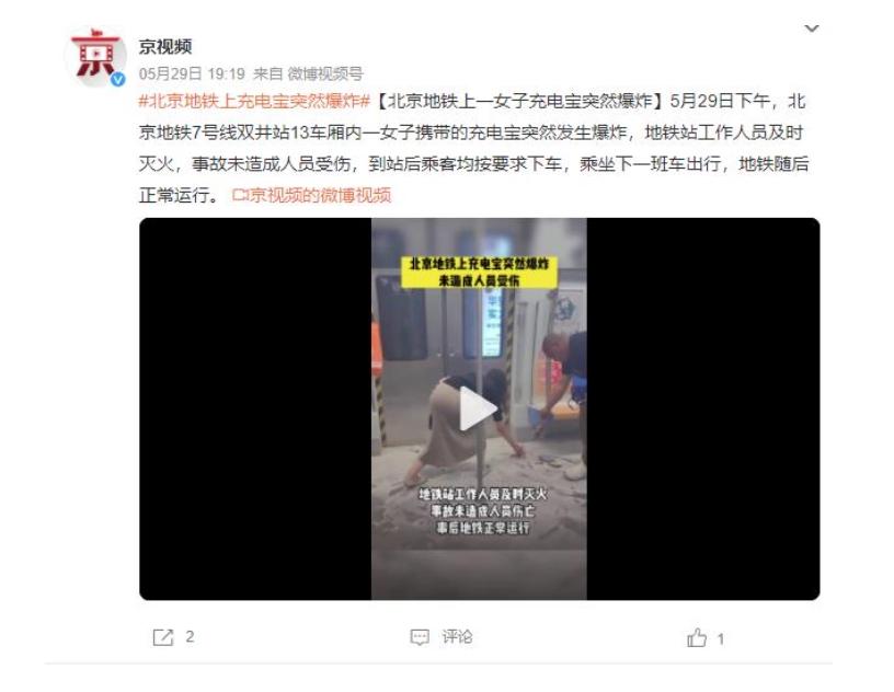 北京地鐵7號(hào)線雙井站13車廂內(nèi)充電寶突然爆炸,工作人員及時(shí)處置未造成傷亡