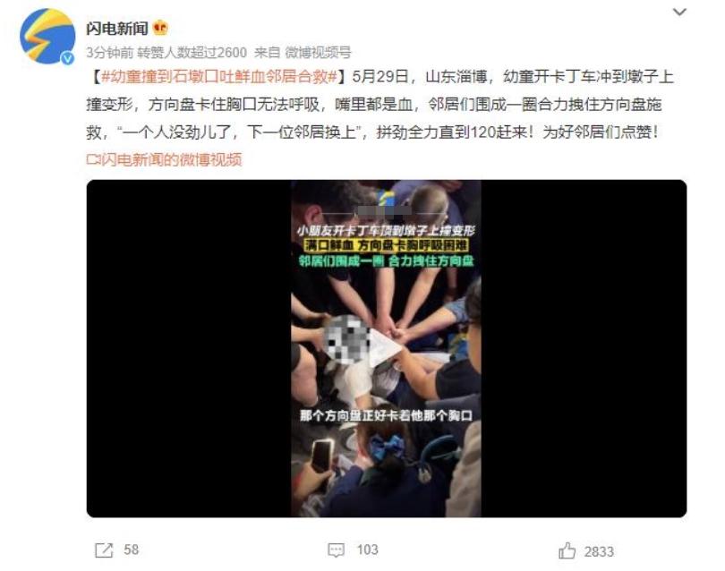 近日,山東淄博發生了一起令人心驚的事故,一名幼童開卡丁車沖到墩子上撞變形,導致方向盤卡住胸口無法呼吸,口中不斷吐出鮮血。幸運的是,周圍的鄰居們發現了這一情況,迅速圍成一圈,齊心合力施救。他們輪流拽動方向盤,全力救援,直到急救人員趕到現場。