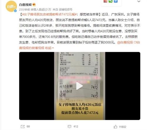 導(dǎo)讀 最近,在廣東深圳發(fā)生了一起事件。一名女子前往捧場她朋友開的人均420元飯店,然而朋友卻提前幫她點了一筆共計7472元的餐費(fèi)。當(dāng)事人陳女士