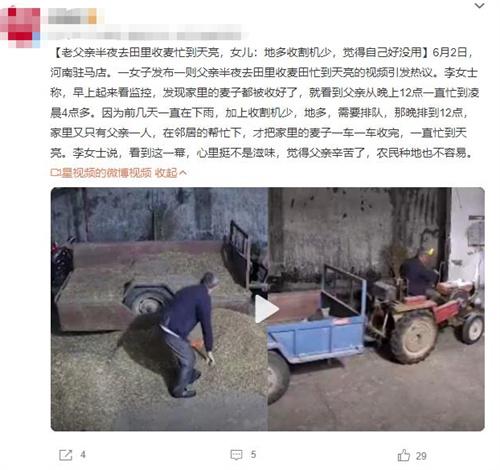 李女士解釋說,由于前幾天連續下雨,加上收割機數量不足,田地又很大,需要排隊等待收割機的使用。那個晚上,排隊等待一直延續到了半夜12點,而家里只有她的父親一人在等待中。幸好鄰居得知情況后前來幫忙,才能順利將家里的麥子一車一車地收割完畢,一直忙到天亮。