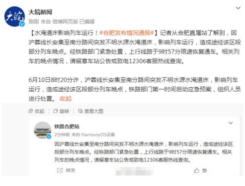 據合肥直屬站消息,滬蓉線長安集至南分路段突發水淹事件,導致列車運行受阻,部分列車晚點。鐵路部門迅速采取緊急措施,恢復通行速度,上行線路已在上午9時57分恢復正常通車。乘客可關注車站公告或撥打12306客服熱線了解相關列車晚點情況。