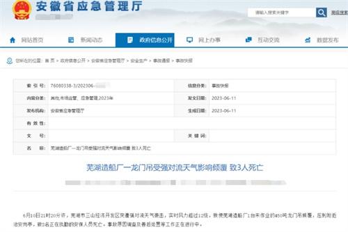 6月10日21時(shí)20分許,蕪湖市三山經(jīng)濟(jì)開發(fā)區(qū)突然遭到了強(qiáng)對(duì)流天氣的襲擊。實(shí)時(shí)風(fēng)力超過了12級(jí),造成了嚴(yán)重的后果。在這場(chǎng)突如其來(lái)的災(zāi)難中,蕪湖造船廠發(fā)生了一起悲劇性的事故,一臺(tái)未作業(yè)的450噸龍門吊傾覆,壓到了附近的治安崗?fù)ぃ瑢?dǎo)致3名正在執(zhí)勤的安保人員不幸喪生。目前,有關(guān)事故的原因調(diào)查和善后處置等工作正在進(jìn)行中。