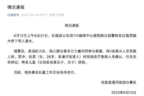 接到報警后,社旗縣消防大隊迅速行動,同時得到了熱心群眾的積極參與,多方力量共同展開了營救行動。經過大家的共同努力,成功將3名落水人員從水中救出并送上岸。值得一提的是,其中一位叫做張某的女性(26歲,居住在潘河街道)經現場醫療急救人員確認已無生命體征,不幸遇難;而她的兩個孩子(分別是長子和次子)則幸運地獲救。