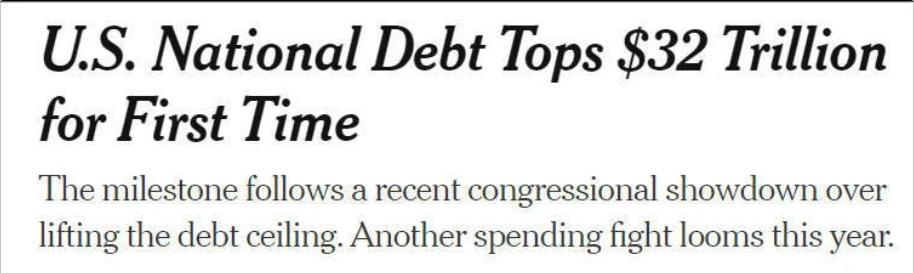 據(jù)《紐約時報》報道,美國財政部最新公布的數(shù)據(jù)顯示,美國國債首次突破32萬億美元,比之前預(yù)測的時間提前了9年。經(jīng)濟低迷背景下,美國政府為應(yīng)對新冠疫情的緊急支出是導(dǎo)致這一情況的主要原因。隨著新冠紓困法案、基礎(chǔ)設(shè)施建設(shè)法案等措施的出臺,拜登政府為籌集資金而不斷增發(fā)債券。而美聯(lián)儲多次激進加息也導(dǎo)致美國政府債務(wù)利息的上升。根據(jù)去年10月財政部公布的數(shù)據(jù),美國政府債務(wù)規(guī)模首次超過31萬億美元。