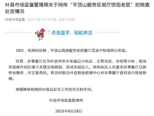 根據"葉縣市場監管"微信公眾號發布的消息,河南省平頂山市葉縣市場監督管理局于19日通報了對網傳"平頂山服務區餐廳驚現老鼠"事件的核查處置情況。