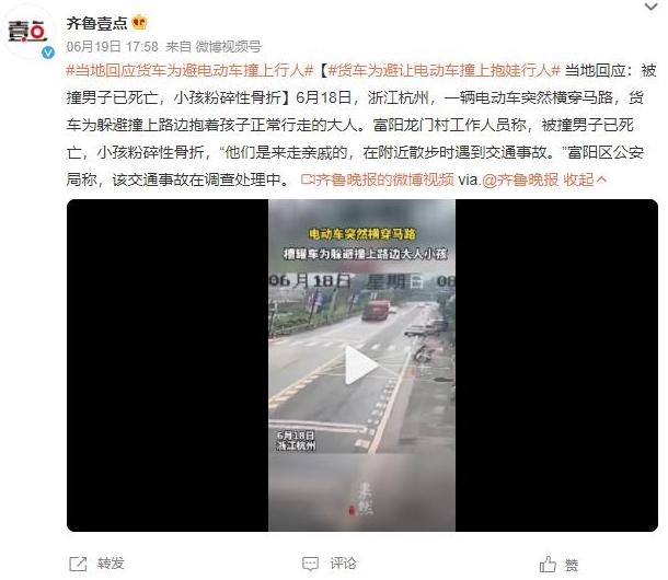 【男子死亡、孩子受重傷】貨車為躲避電動車,不幸撞上路邊行走的抱娃行人。據浙江杭州富陽區龍門村工作人員透露,被撞男子不幸身亡,而小孩則遭受了粉碎性骨折。工作人員表示,這對家庭是來走親訪友的,不幸在附近散步時遭遇了這起交通事故。富陽區公安局表示,目前正在調查處理該交通事故。