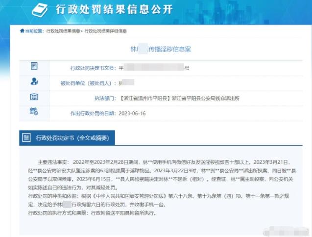 近日,在浙江政務服務網上出現了一起罕見的行政處罰案例。一名來自平陽的男子林某某因“傳播淫穢信息”而受到派出所的行政拘留處罰,為期六天。