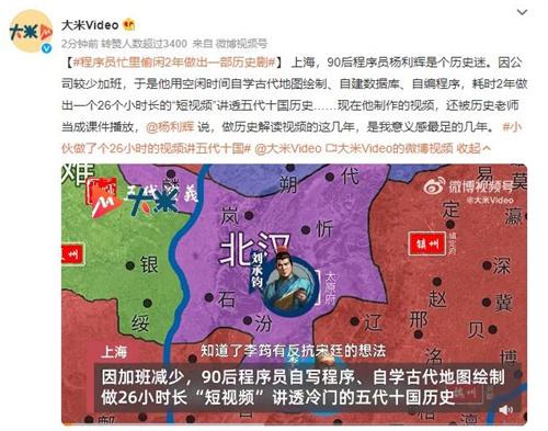 90后程序員楊利輝是一個對歷史情有獨鐘的年輕人。盡管在工作中比較少加班,但他充分利用空閑時間自學古代地圖繪制、自建數據庫和自編程序,耗時2年完成了一部長達26個小時的“短視頻”,詳細解讀了五代十國歷史。如今,他制作的視頻甚至被歷史老師作為課件播放。