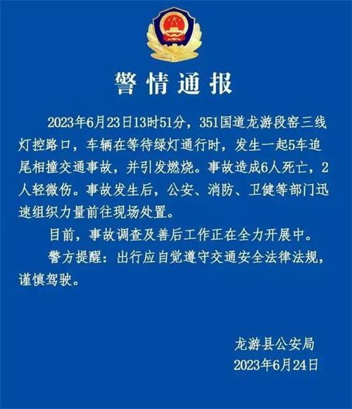 龍游公安于6月24日發(fā)布通報,介紹了發(fā)生在6月23日的一起嚴重交通事故。據(jù)通報,事故發(fā)生在351國道龍游段窯三線燈控路口,當時多輛車輛在等待綠燈通行時發(fā)生了連環(huán)追尾相撞,并導(dǎo)致車輛起火。該事故造成6人死亡,還有2人輕微受傷。當局立即展開救援和善后工作,并正在全力進行事故調(diào)查。