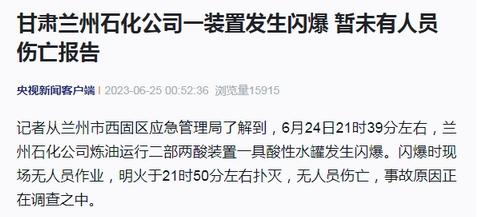 據(jù)蘭州市西固區(qū)應(yīng)急管理局透露,發(fā)生在6月24日21時39分左右的一起事故中,蘭州石化公司煉油運(yùn)行二部的兩酸裝置中的一具酸性水罐發(fā)生了閃爆事件。幸好事發(fā)時現(xiàn)場沒有人員作業(yè),明火在21時50分左右被撲滅,所幸沒有人員傷亡。目前,事故的具體原因正在進(jìn)行調(diào)查。