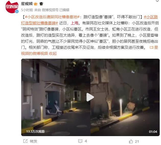近日,上海一小區進行改造后,引發了居民們的不滿。他們在社交媒體上抱怨稱,改造后的路燈形狀詭異,看起來像墓碑,給小區營造了一種陰森的氛圍,使得小區被形容為“墓區”。市民王女士表示,晚上小區昏暗的燈光讓居民們感到不安,一些膽小的居民甚至不愿夜晚外出。相關部門回應稱,由于工程接近尾聲,無法及時征求意見,但會根據計劃進行改善,以解決居民的擔憂。