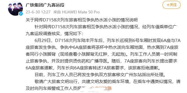 6月30日,根據@廣鐵集團廣九客運段的消息,針對網上流傳的D7158次列車旅客相互爭執熱水潑向小孩的情況,經過廣九客運段的調查核實,確認了事件的經過。據調查結果顯示,6月29日,D7158次列車在陸豐出發后,列車長在巡視到6號車廂時發現6A座和7A座的旅客發生了爭執。在爭執過程中,6A座的旅客將茶杯中的熱水潑灑到了車廂地面,熱水濺到了7A座旅客同行的小孩的腳背上(現場檢查顯示小孩的腳背無紅腫和起泡現象)。列車工作人員立即制止了旅客的爭執,并及時提供了燙傷藥品,并通過廣播尋找醫生。隨后,7A座旅客要求6A座旅客道歉,列車長將這一要求轉達給了6A座旅客,但該旅客拒絕道歉。目前,列車工作人員已將爭執雙方的旅客移交給廣州東站派出所進行處理。