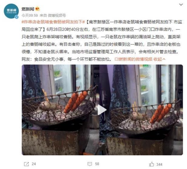 【南京鼓樓區(qū)炸串店老鼠啃食香腸現(xiàn)場,市監(jiān)局回應檢查食品安全】