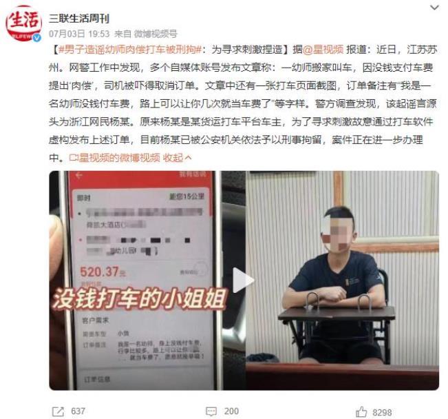 近日,據(jù)@星視頻報(bào)道,江蘇蘇州發(fā)生了一起事件。在網(wǎng)警工作中,發(fā)現(xiàn)多個(gè)自媒體賬號(hào)發(fā)布文章稱(chēng)一名幼師搬家叫車(chē)時(shí)因沒(méi)有錢(qián)支付車(chē)費(fèi),提出以"肉償"的方式,結(jié)果司機(jī)被嚇到取消了訂單。文章中還附有一張打車(chē)頁(yè)面截圖,其中訂單備注顯示了"我是一名幼師,沒(méi)錢(qián)付車(chē)費(fèi),路上可以讓你幾次就當(dāng)車(chē)費(fèi)了"等字樣。警方調(diào)查發(fā)現(xiàn),這起謠言的源頭是浙江網(wǎng)民楊某。原來(lái),楊某是某貨運(yùn)打車(chē)平臺(tái)的車(chē)主,出于尋求刺激的目的,故意通過(guò)打車(chē)軟件編造了上述訂單。目前,楊某已被公安機(jī)關(guān)依法刑事拘留,案件正在進(jìn)一步辦理中。
