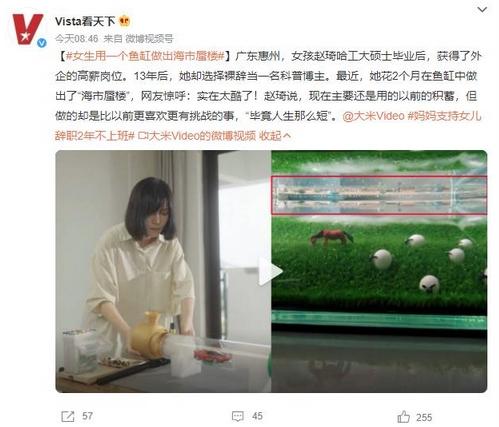 廣東惠州的女孩趙琦,畢業于哈工大并獲得外企高薪崗位。然而,經過13年的職業生涯后,她做出了一個讓人意想不到的決定,裸辭并轉行成為一名科普博主。最近,她用兩個月的時間在一個魚缸中打造了一座驚人的“海市蜃樓”,引來網友們的驚嘆和贊嘆:這太酷了!趙琦表示,雖然她目前主要依靠以前的積蓄生活,但她所從事的工作比以前更加喜歡和有挑戰性,畢竟人生如此短暫。
