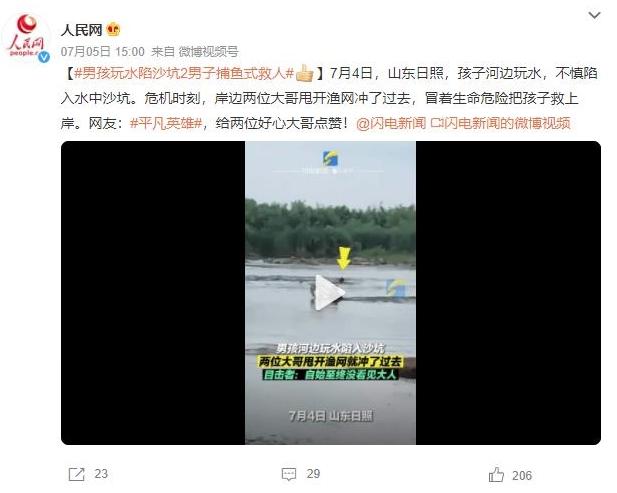 近日,山東省日照市發(fā)生了一起感人至深的事件。7月4日,一名孩子在河邊玩水時不慎陷入水中的沙坑,危急時刻,兩位身著普通服裝的大哥毫不猶豫地甩開手中的漁網(wǎng),冒著生命危險迅速沖向孩子,成功將其救上岸。這一英勇行為引發(fā)了眾多網(wǎng)友的點贊和贊揚,被稱為平凡英雄。