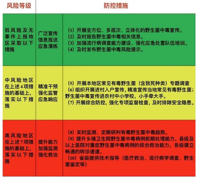 根據不同風險等級地區的特點和需求,針對性制定了2023年全省有毒野生菌中毒風險防控措施。這些措施包括宣傳發動、信息報送、加強監測、精準干預、強化監管、應急響應和強化救治等方面的內容。對于高風險地區,將加強宣傳教育,提高公眾對有毒野生菌的認知和防范意識;加強監測工作,及時掌握風險情況;建立精準干預機制,對中毒事件進行快速響應和處置。對于中風險地區,將加強監管力度,加強對有毒野生菌的采摘、銷售和消費環節的監管,確保食品安全。對于低風險地區,將加強風險宣傳和教育,提醒公眾注意采摘和食用的安全性,加強監測預警工作,確保食品安全穩定。