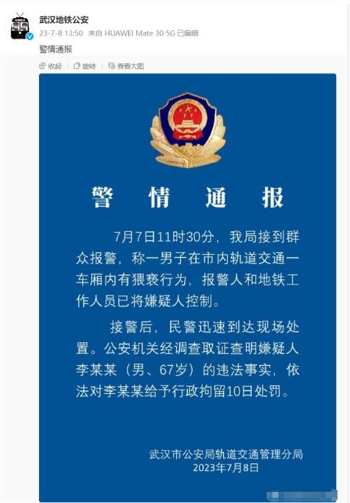 據武漢地鐵公安部門8日消息,7月7日11時30分,一名男子在武漢市內的地鐵車廂內被群眾發現有猥褻行為,隨后報警人和地鐵工作人員將嫌疑人控制住。接到報警后,地鐵公安部門迅速派出民警到達現場處理。經過調查取證,警方確認了嫌疑人李某某(男,67歲)的違法事實,根據法律規定,對李某某進行了10日的行政拘留處罰。