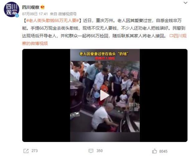 近日,在重慶萬州發生了一起溫暖而令人感動的事件。一位老人因為妻子過世后,深感金錢的無能為力。于是他手提著66萬現金走上街頭,準備散錢給路人。然而,意外的是,在現場并沒有人接受他的善意,反而有很多人勸他妥善保管好錢財。當地民警及時趕到現場,對老人進行開導,并與周圍的群眾一起將66萬現金保管妥善,隨后聯系老人的家人將他接回家。