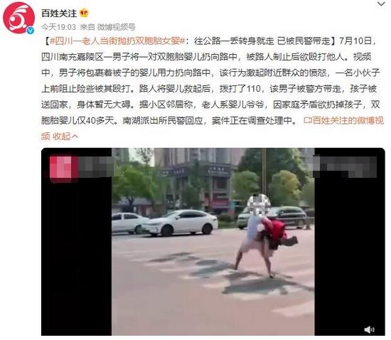 四川南充嘉陵區發生了一起令人震驚的事件。據報道,7月10日,一名男子在當街將一對雙胞胎嬰兒扔向路中,并試圖毆打路人。視頻顯示,這名男子用力拋擲被子包裹著的嬰兒,這一行為引起了附近群眾的憤怒。一位年輕人勇敢地上前阻止,差點被男子毆打。路人將嬰兒救起后,立即撥打了110報警電話。警方很快趕到現場將男子帶走,嬰兒則被送回家中,目前身體沒有大礙。