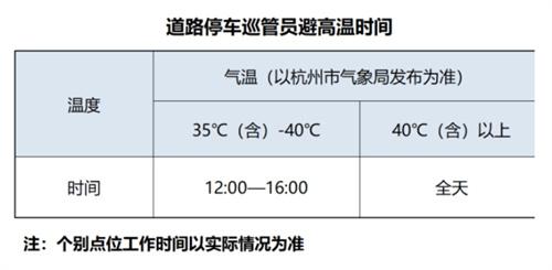 具體而言,根據杭州市氣象局發布的氣溫情況,如果某日最高氣溫達到40℃及以上,杭州的巡管員將全天都不需要外出進行作業,以避免高溫給工作人員帶來的不適和危險。與此同時,車輛在這一天停放在指定停車點位上也將免費(除個別點位)。