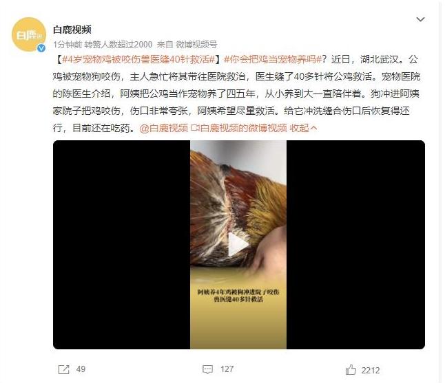 最近,湖北武漢發生了一起溫馨而不尋常的故事。一只公雞被寵物狗咬傷,主人急忙將其帶往醫院進行救治。醫生為公雞縫了40多針,成功挽救了它的生命。據寵物醫院的陳醫生介紹,這只公雞是一位阿姨四五年來養的寵物,從小到大一直陪伴在她身邊。