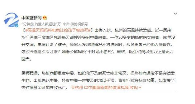 近期,杭州市高溫天氣持續,給人們的生活和健康帶來了一定的困擾。然而,令人遺憾的是,一位年僅30多歲的女性因為將電扇讓給孩子,在家中未開啟空調的情況下被熱射病奪去了生命。這一悲劇引起了人們的深思和警醒。