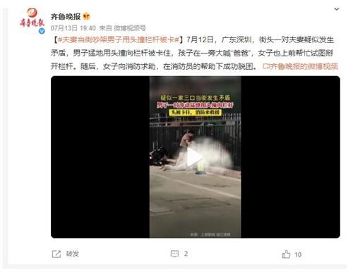 7月12日,廣東深圳市一對夫妻在街頭發(fā)生矛盾,男子情緒激動之下猛地用頭撞向欄桿,結(jié)果卡住無法脫身。孩子目睹父親困境,大聲呼喊著"爸爸",而妻子也緊急上前尋求幫助并向消防隊(duì)求援。經(jīng)過消防員的協(xié)助,男子最終成功脫困。