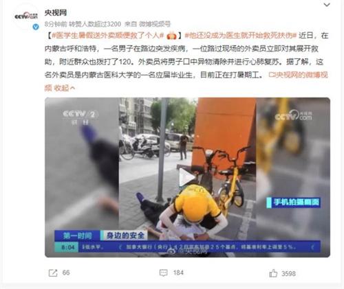 這位外賣員不僅迅速清除了男子口中的異物,還進行了心肺復蘇術,為他爭取了寶貴的時間。據了解,這位外賣員是一名內蒙古醫科大學的應屆畢業生,目前正在打暑期工。他的醫學知識和應急處理能力發揮了重要作用,挽救了這名男子的生命。