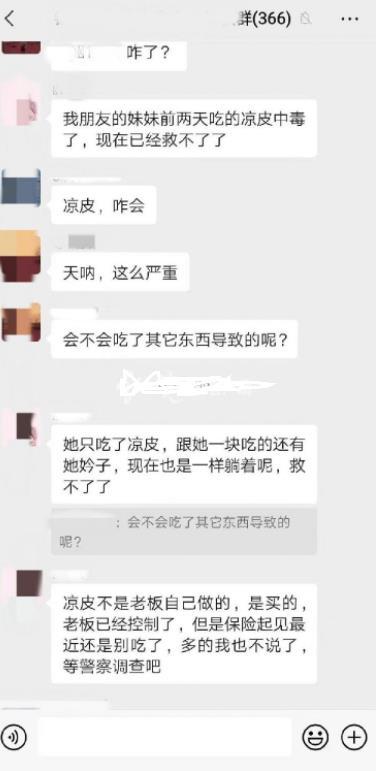 據網傳消息,事發時,一名約20歲的女孩與家人在永城市百花街吃了一碗涼皮后中毒,目前該女生正在醫院ICU住院,而她同行的舅媽已經不幸離世。為防范風險,永城市全市涼皮店已被要求停止銷售。消息最早出現于7月10日,一份微信業主群的聊天截圖顯示,一位業主稱其朋友的妹妹吃涼皮中毒已無法挽救,而舅媽同樣也無法幸免。關于中毒原因,網傳消息存在兩種說法,一種稱涼皮中添加了過量的硼砂,另一種稱涼皮發生了變質,滋生了米酵菌酸,從而引發中毒。