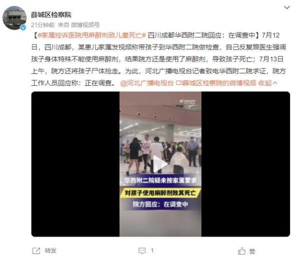 【家屬指控醫(yī)院使用麻醉劑致兒童死亡,四川成都華西附二院回應(yīng):正展開調(diào)查】