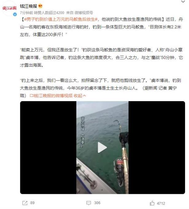 “我們釣上來后,僅僅拍了照留念,便立即剪斷釣線將它放生。”虞本博表示,將大魚放生是漁民的傳統。作為土生土長的舟山人,今年36歲的虞本博深深懂得這種傳統的重要性。