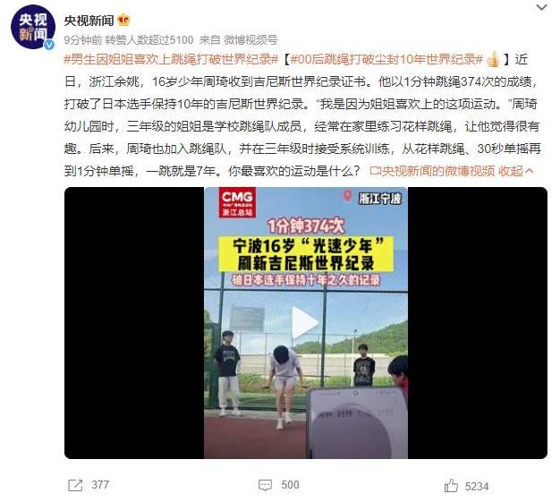近日,浙江余姚的16歲少年周琦獲得了吉尼斯世界紀(jì)錄證書(shū)。他以每分鐘374次的跳繩成績(jī),成功打破了日本選手保持了長(zhǎng)達(dá)10年的吉尼斯世界紀(jì)錄。“我之所以開(kāi)始跳繩,是因?yàn)槭艿搅私憬愕挠绊憽?rdquo;周琦回憶道,在他還在幼兒園時(shí),他的三年級(jí)姐姐是學(xué)校跳繩隊(duì)的成員,經(jīng)常在家里練習(xí)各種花樣跳繩,這讓他覺(jué)得非常有趣。后來(lái),周琦也加入了跳繩隊(duì),并在三年級(jí)時(shí)開(kāi)始接受系統(tǒng)的訓(xùn)練。從花樣跳繩到30秒單搖,再到最終的1分鐘單搖,周琦一跳就跳了整整7年。那么,你最喜歡的運(yùn)動(dòng)是什么呢?