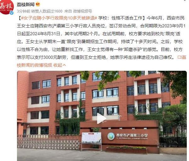 女子應聘西安市小學行政崗位10多天后被辭退,學校稱性格不適合工作