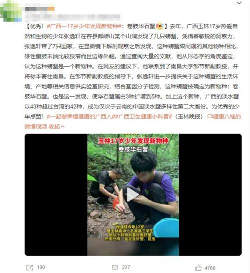 廣西玉林市的17歲少年張逸軒是一名熱愛自然和生物的學生。去年,他在容縣都嶠山某個山澗的探險中偶然發現了幾只螃蟹。對于自然界的好奇和敏銳的洞察力讓他注意到這些螃蟹與同屬的其他物種有所不同。帶著7只螃蟹回家后,他利用顯微鏡進行仔細觀察,并發現這些螃蟹的雄性腹肢末端較為狹窄且邊緣外翻。這一發現引起了他的興趣,開始嘗試從形態學的角度對這些螃蟹進行鑒定。