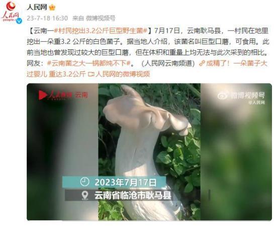 7月17日,云南耿馬縣的一位村民在地里挖掘出一朵重達3.2公斤的巨型口蘑。當地居民稱其可供食用。此前,當地曾發現過較大的巨型口蘑,但在體積和重量上均無法與此次采集的相比。社交媒體上的網友紛紛調侃稱云南的蘑菇實在太大了,一鍋燉不下。(人民網云南頻道報道)