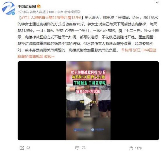鐘女士向記者透露,她每天下班后的第一件事就是去爬樓梯。她選擇了一座樓共21層,每天爬4-5趟。通過堅持這個健身習慣,她成功減掉了十二三斤的體重,而她的三餐飲食并沒有過多地受限制。