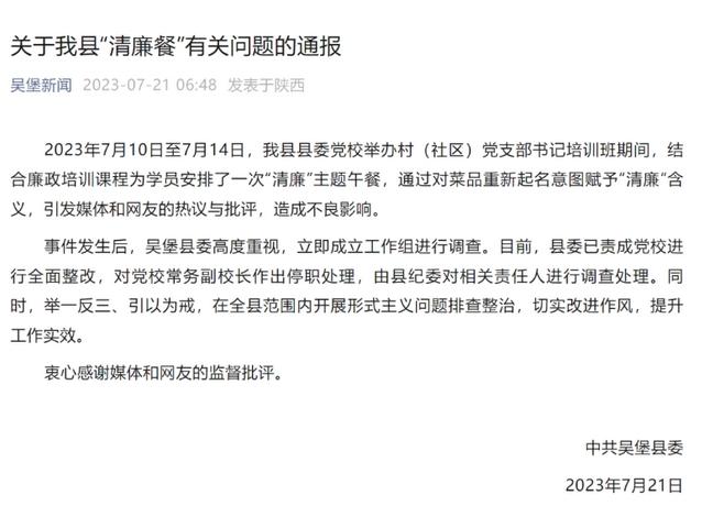 據吳堡縣融媒體中心微信公眾號發布的《關于我縣“清廉餐”有關問題的通報》,事件發生在7月10日至7月14日的縣委黨校舉辦村(社區)黨支部書記培訓班期間。在廉政培訓課程中,為學員安排了一次以“清廉”為主題的午餐,采取重新命名菜品的方式,試圖賦予“清廉”含義。然而,這樣的做法卻引發了媒體和網友的強烈批評和討論,造成了不良影響。