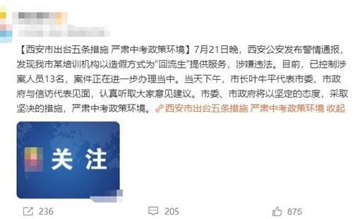 根據西安發布官微消息,西安公安部門近日發布警情通報,揭露了一起涉嫌違法的事件。據悉,該市一家培訓機構涉嫌以造假方式為“回流生”提供服務,引起了廣泛關注。目前,西安警方已經采取行動,控制了涉案人員13名,并對該案件展開進一步調查。