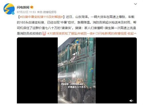 當(dāng)天,菏澤市遭遇酷暑天氣,高溫天氣對(duì)于攜帶在車上的白豬來(lái)說(shuō)格外艱難。大貨車爆胎后,車上的豬群受到驚嚇和氣溫驟升的影響,出現(xiàn)了明顯的中暑癥狀,需要緊急救助。