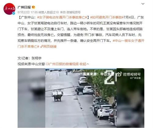 【廣東中山:女子騎電動車遇開門殺事故身亡】7月4日,廣東中山發生了一起悲劇,一名女子甘某駕駛電動自行車時,不幸遇到了開門殺事故,導致她不幸身亡。據了解,事故發生時,一輛小轎車的司機王某在沒有留意車外情況的情況下開門下車,而甘某因為來不及避讓,撞上了車門,整個人和車一起倒地。由于頭部著地造成顱腦損傷,最終甘某搶救無效,不幸離世。