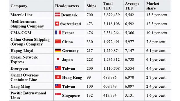 根據聯合國貿易和發展會議截至2018年6月1日的數據,世界十大集裝箱運輸公司名單按其船隊20英尺當量單位(TEU)的順??序排列。