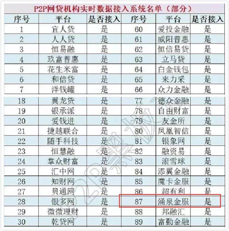 目前,全國完成P2P實時數據接入的網貸平臺名單未公開,P2P黑板報據公開數據不完全統計顯示,已有118家P2P平臺接入。該名單顯示,涌泉金服已經按照監管部門要求,順利將實時數據接入國家互聯網應急中心網貸機構數據報送系統。