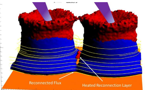 該模擬對中國研究高能密度等離子體的實驗結果建模,該等離子體在極端壓力狀態下起作用。實驗使用激光從固體金屬靶吹出一對等離子體氣泡。三維等離子體的仿真(圖1)跟蹤了氣泡的膨脹和Biermann效應產生??的磁場,跟蹤了磁場的碰撞以產生磁重連。研究人員在橡樹嶺國家實驗室的美國能源部橡樹嶺領導力計算設施的Titan超級計算機上執行了這些模擬。