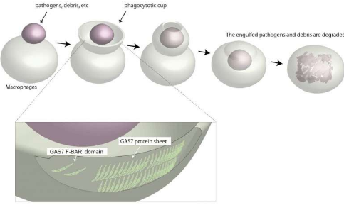 研究表明,GAS7的存在可以標記巨噬細胞膜上的哪些部位會變形為吞噬杯。通過將巨噬細胞暴露于酵母聚糖(科學家們用來模擬微生物的一種葡聚糖)中,研究人員發現GAS7以及其他各種指示吞噬作用開始積累的分子。