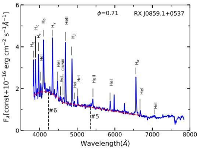 通常,研究證實(shí)RX J0859,RX J0749和RX J0649屬于一類日蝕極點(diǎn)。這些光源的光曲線顯示出日食的特征,即深度,整體和形狀可變。這三個(gè)系統(tǒng)的光譜均表現(xiàn)出強(qiáng)的高電離發(fā)射線和反向的Balmer減量,這證實(shí)了它們的磁性。