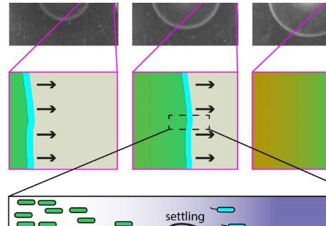使用高速顯微鏡,研究人員能夠追蹤成千上萬個細菌的運動,這些細菌形成了所謂的趨化性“溫帶環”,這是一個易于觀察的“波紋”,在細菌感染后會向外擴展。一滴細菌被引入營養豐富的棲息地(見圖1A)。令他們驚訝的是,研究人員觀察到,“群生環”不僅僅是通常認為的一小部分分散細菌。取而代之的是,細菌的環包括開拓者的探索者,它們在遷移時會復制,留下一串后代(見圖1B,C)。