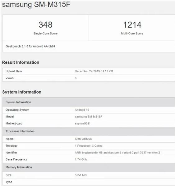 據報道,正在開發中的三星Galaxy M31智能手機已在基準測試網站Geekbench上浮出水面。據報道,即將上市的Galaxy M系列手機將配備三星SM-M315F型號。根據Geekbench的清單,三星Galaxy M31將與驅動Galaxy M30s智能手機的Exynos 9611 SoC相同。該芯片組的時鐘頻率為1.74GHz,包括八個內核。這是對之前的傳聞牛逼帽子聲稱手機將擁有的Snapdragon 665 SoC的引擎蓋下。